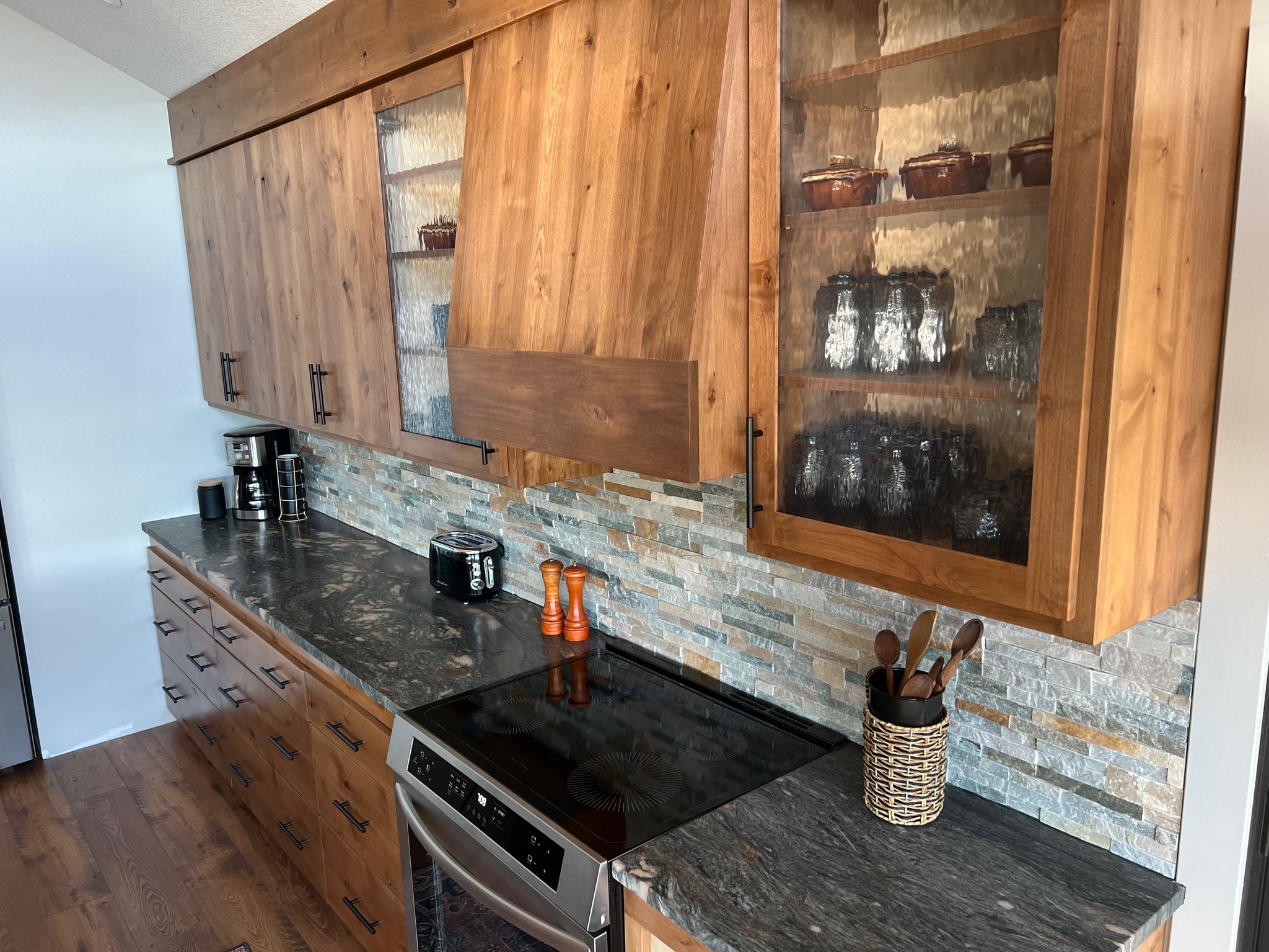 ✔ Fully stocked kitchen with Knotty Alder cabinetry and quartzite countertops