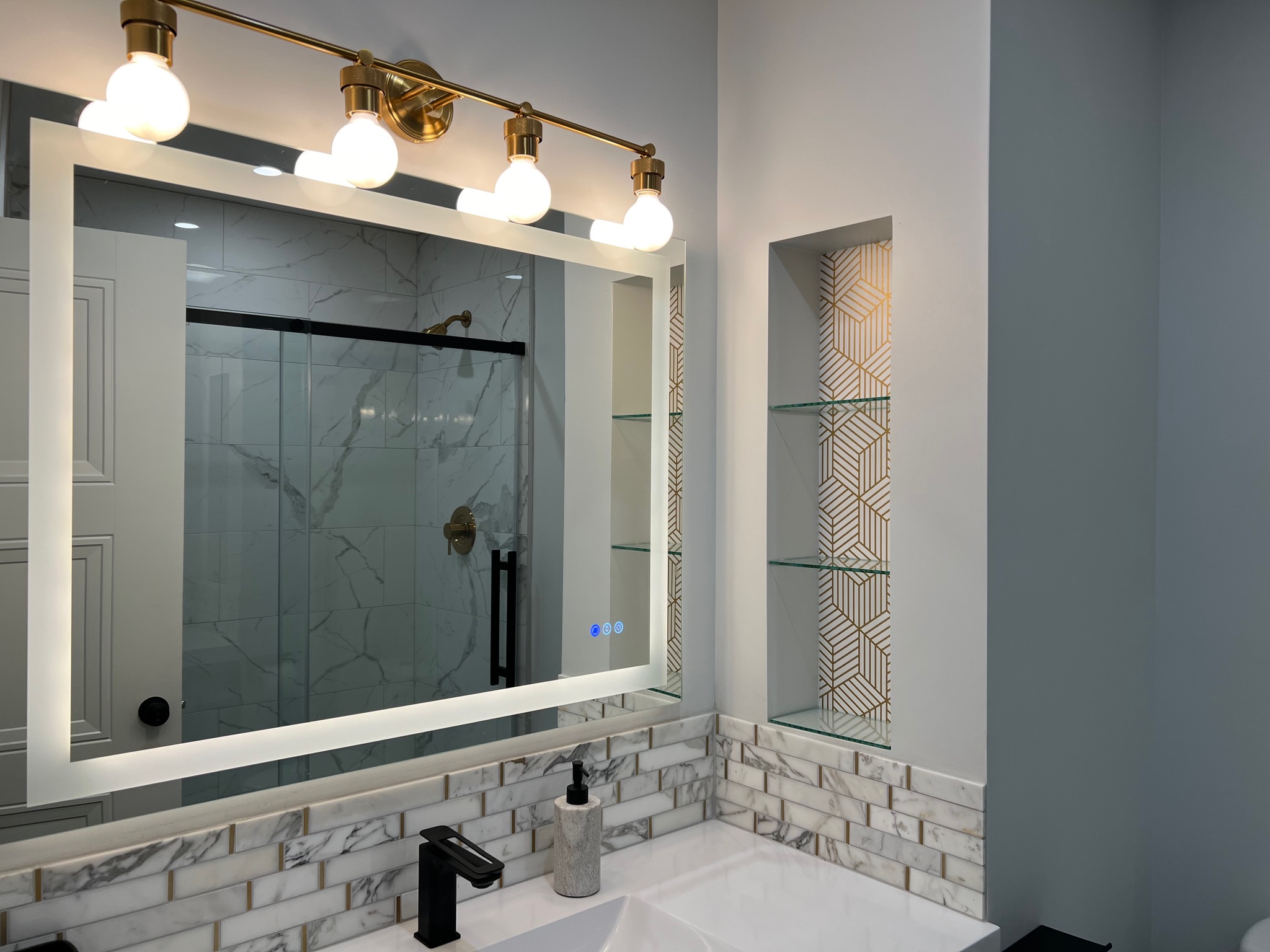 ✔ Ensuite 1: Black and white design with gold accents, LED mirror, and walk-in tiled shower